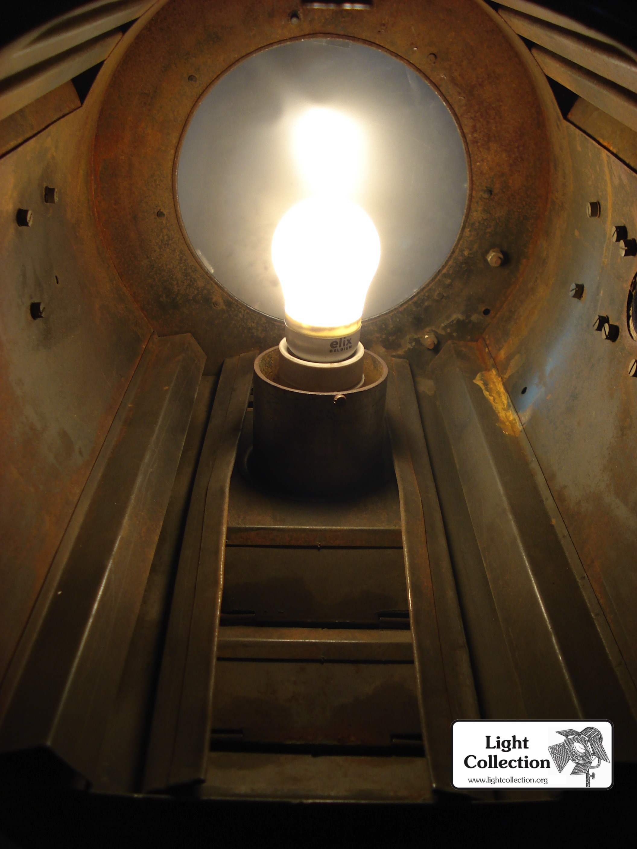 Un autre point intéressant de ce projecteur est le réflecteur derrière la lampe. Dans le cas présent, il est manquant, mais il est normalement monté sur une couronne actionnée par un axe permettant de régler la distance entre le réflecteur et la lampe.